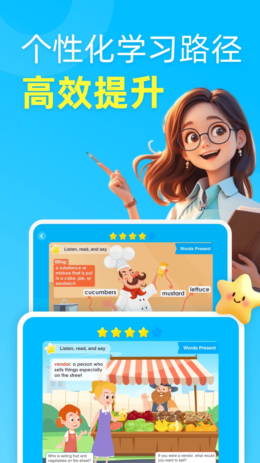 2.随时随地学习:支持在线学习,不受时间和地点的限制,方便孩子随时随地学习英语。