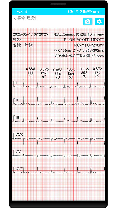 本应用程序是小蜜蜂心电传感器的配套程序。小蜜蜂心电传感器采集心电信号,通过蓝牙将传输到本应用程序。本应用程序接收到心电信号并处理后显示出心电波形和心电波形参数。