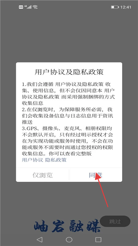 1、下载安装完成后进入,需在用户协议和隐私政策界面点击同意,接受相关条款后才能进入应用。