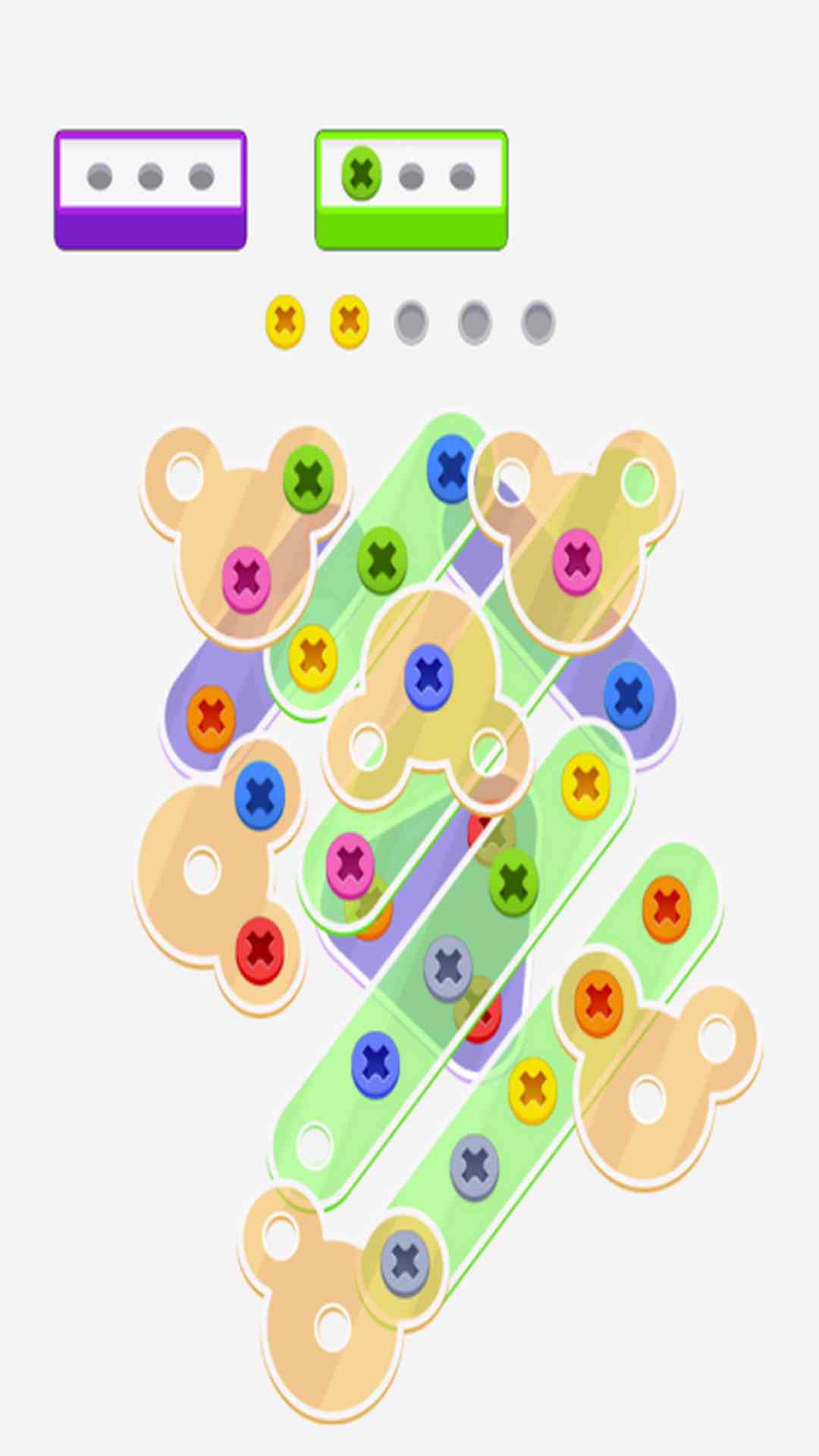 3、轻触松开相同颜色螺丝,打到正确位置合并同类,以巧妙拆解透明板重叠迷局~