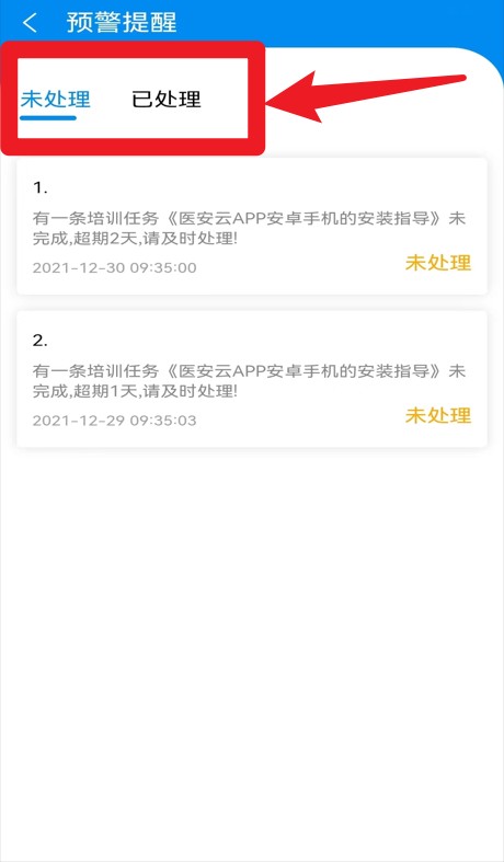 3、预警提醒页面可查看未处理与已处理任务,点击标签页快速切换查看处理状态。