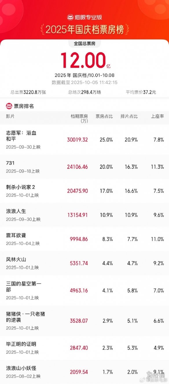 截至10月5日11时42分,2025年国庆档档期票房已突破12亿。其中《志愿军:浴血和平》《731》《刺杀小说家2》分列前三。其中《731》是9月18日上映,且近期票房严重下滑;第四的《浪浪人生》上映5天票房1亿3000万;因此《震耳欲聋》有望超越两者,成为国庆档票房前三。