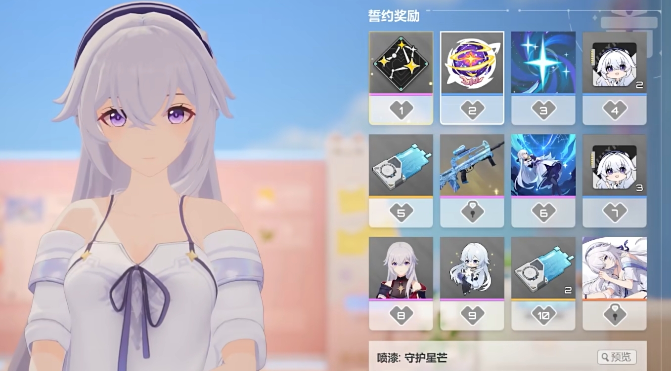 誓约礼物的获取方法比较多,各位可参与卡拉比丘的各项活动来获取,也能从礼品箱里开出来,但总体来说还是比较缺的,所以各位需做好送礼的规划,除非只想提升某一角色的好感,否则不要把所有礼物都送给她,只送加好感度高的即可。每次誓约等级提升后,都可解锁对应等级的誓约奖励,例如专属的个人剧情和誓约壁纸等,当誓约等级达到10级后,就能领完该角色的所有誓约奖励,各位可在誓约任务里查看每位角色在不同誓约等级下的奖励详情。